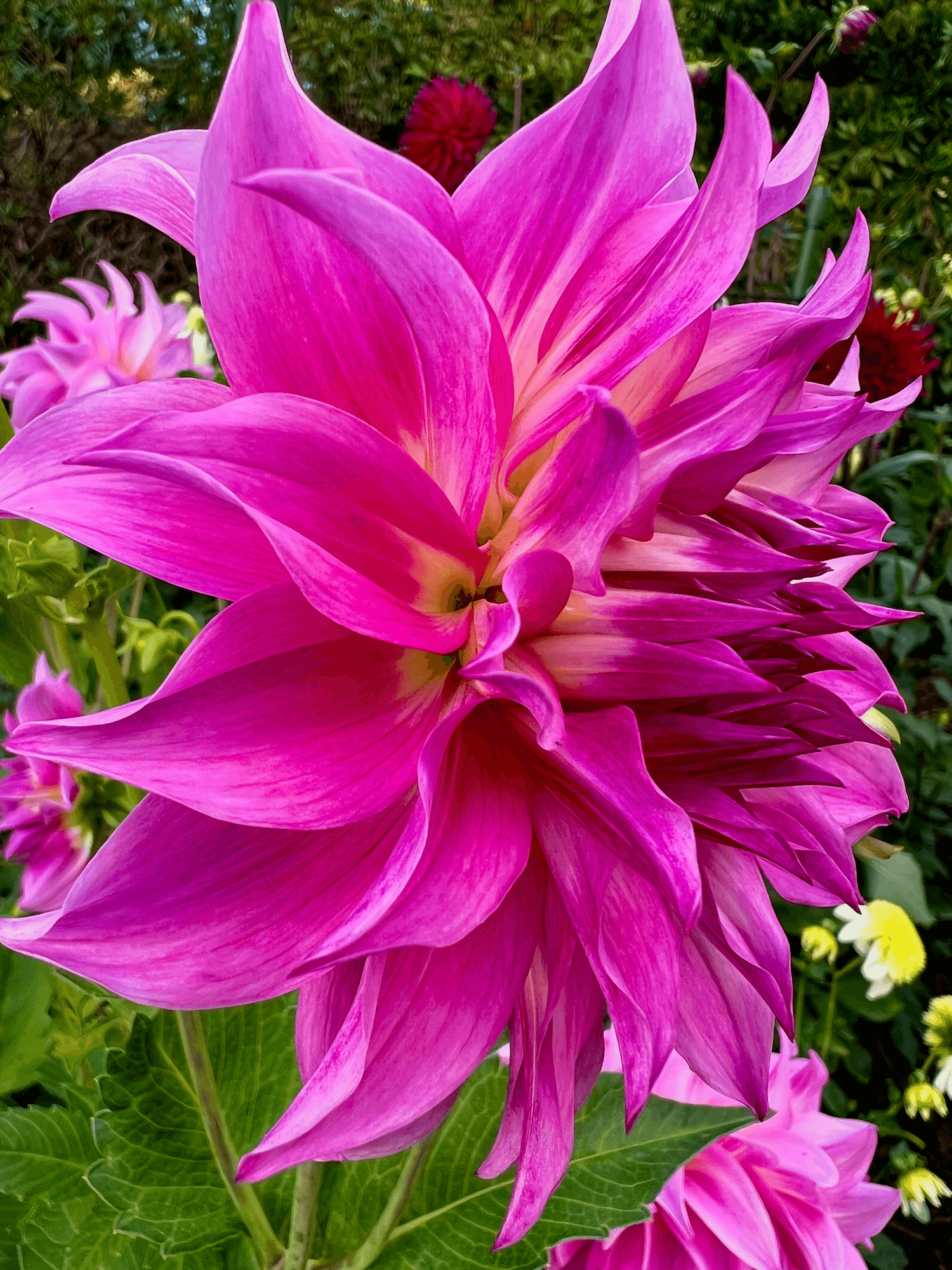 A dahlia flower garden bloom with long stems showing off pink, yellow, and white flowers, surrounded by green foliage.
